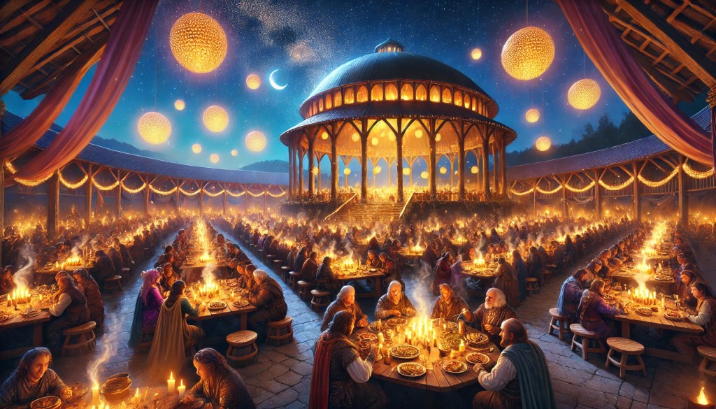 As the orchestra’s music softened, the energy of the feast began to shift. One by one, glowing orbs blinked to life along the edges of the market square, casting a soft, chromatic glow over the cobblestoned streets, highlighting the various merchant carts that lined the edges of the market square.